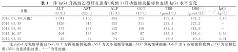 | 日期 | ALT(U/L) | AST(U/L) | ALP(U/L) | GGT(U/L) | TBil(μmol/L) | DBil(μmol/L) | IgG4(g/L) |