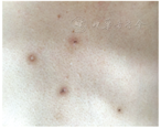 入院体格检查:生命体征平稳,颈部、胸部、背部可见散在片状紫褐色皮疹,无压痛,压之不褪色。右下腹可见一斜行长约4 cm的陈旧性手术瘢痕,以及一纵行长约10 cm的陈旧性手术瘢痕,均愈合良好。全腹无明显压痛,无反跳痛,无肌紧张,其余体格检查未见明显异常。