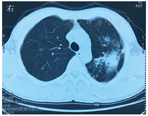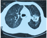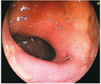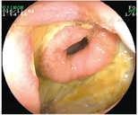 患者进食后呕吐,有间断右下腹隐痛,数字分级法(numeric rating scale,NRS)约3分,无发热,排便1次/d,无便血,无咳嗽、咳痰。持续胃肠减压,每日引流黄绿色液体约500~1 000 mL,给予加强营养支持。经多学科讨论,诊断为系统性血管炎。于2016年11月17日开始静脉滴注甲基泼尼松龙40 mg/d,并拔除胃管,鼓励患者进食,患者呕吐、食欲逐渐好转,腹痛减轻。10 d后改为醋酸泼尼松片40 mg/d,患者呕吐、腹痛逐渐消失,食欲、食量好转,体质改善后出院。继续采用醋酸泼尼松治疗并逐渐减量。2017年2月13日复诊,患者诉右下腹少许不适,无发热,排便1次/d,黄色软便,无咳嗽、咳痰,无胸闷、气短。复查ESR为29 mm/1 h;胸部CT检查(图9)显示:与2016年11月16日相比,左肺上叶空洞灶较前缩小,周围散在病变及左肺下叶背段结节基本同前。结肠镜检查(图10)显示:回肠末端未见明显异常,距肛门约50 cm处见回结肠吻合口,所见黏膜尚光滑,充血明显,触碰易出血,未见明显隆起及凹陷性病变,病变范围较前明显好转。嘱患者口服醋酸泼尼松20 mg/d, 3个月后门诊复诊。2017年5月患者为复查再次来院,一般状况良好,无腹痛、发热,无咳嗽、咳痰,排解黄色软便1次/d。嘱患者醋酸泼尼松逐渐减量至10 mg/d,3个月后再次复诊,并复查胸部CT、结肠镜等。
