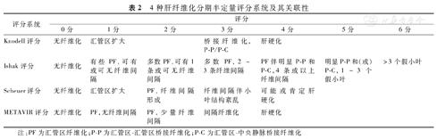肝组织损害程度以炎症分级(grading,G)和纤维化分期(staging,S)来表示。分级是依据坏死和炎症的程度,评估病变的活动程度;分期是依据纤维化程度和肝硬化的形成,表示疾病进展情况,与病程有关,并影响治疗和预后。但任何一个评分系统中的数字都只代表对某种病变类型的半定量评估,而非绝对定量,对界面肝炎、汇管区炎症和肝细胞损伤等不同损伤程度的界定都不是线性相关。1981年Knodell等最早提出半定量评分系统诊断慢性肝炎,将分级和分期的结果分别进行计分,获得组织学活动指数(histological activity index,HAI)。目前常用的有Scheuer、METAVIR和Ishak评分系统(表2)。Scheuer评分系统将肝纤维化分为0至4期。Ishak评分系统是Knodell评分系统的改良版,将肝纤维化评估分为0至6期,是目前国际上用于前后病例对照研究评估肝纤维化变化最敏感和最常用的方法。Ishak评分系统对肝纤维化分期表述如下:Ⅰ期,无纤维间隔;Ⅱ期,1条纤维间隔;Ⅲ期,2或3条纤维间隔;Ⅳ期,4条纤维间隔;Ⅴ期,4条或以上纤维间隔+明确1~3个假小叶;Ⅵ期,>3个假小叶。METAVIR评分系统将肝纤维化分为0至4期;该系统未将汇管区-汇管区和汇管区-中央静脉桥接纤维间隔区分和分类,并且对于"纤维间隔"也未指明是否包括不完全纤维间隔和桥接纤维间隔。一般认为,完全桥接纤维化应作为明确的病理学特征,可定义为2期。
