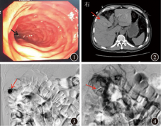 体温36.4 ℃,脉搏63次/min,呼吸频率为18次/min,血压123/78 mmHg。神志清楚、对答切题;皮肤无黄染、蜘蛛痣;左锁骨上等处浅表淋巴结未触及;巩膜轻度黄染,心肺无异常;腹部平坦,未见腹壁静脉曲张,腹部软,中上腹轻压痛,无反跳痛,肝脾未触及,肝区轻叩痛,腹水征阴性,肠鸣音正常;双下肢无浮肿。入院后查血常规示白细胞计数为7.05×109/L,中性粒细胞计数为5.70×109/L (占0.808),血红蛋白为114 g/L,血小板计数为13×109/L;血肌钙蛋白Ⅰ<0.010 ng/mL。血生物化学指标TBil为72.5 μmol/L,DBil为56.0 μmol/L,白蛋白为30.3 g/L,ALT为304 U/L,AST为183 U/L,GGT为591 U/L,ALP为245 U/L;血脂肪酶>2 000 U/L,血淀粉酶为377 U/L。入院后3 h患者突发呕吐暗红色血液1次,量约500 mL,呕吐后上腹部疼痛无缓解。体格检查示体温36.5 ℃,脉搏80次/min,呼吸频率为19次/min,血压90/60 mmHg,神志清楚,贫血面容,睑结膜苍白,巩膜轻度黄染,心肺未见明显异常,腹部平坦,中上腹轻压痛,无反跳痛,叩诊鼓音,肝区轻叩痛,肾区无叩击痛,移动性浊音为阴性,肠鸣音为4次/min。病床旁行急诊胃镜检查发现,胃腔内大量血性内容物和血凝块、食物残渣,清除血凝块,冲洗胃腔后逐个部位检查,发现十二指肠乳头部有血液渗出,考虑胆道出血(图1)。急诊全腹CT平扫+增强扫描显示胆囊内高密度影,出血可能;肝内外胆管稍扩张;胰头区少许渗出性改变(图2、图3)。急诊选择性数字减影血管造影(digital subtraction angiography,DSA)检查右肝动脉分支血管可见不规则囊状假性动脉瘤改变,造影剂明显滞留,并见造影剂外渗现象(图4)。