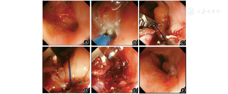 例3 患者男,26岁,2011年因脑外伤行气管切开,保留气管套管3个月余,拔管后患者呛咳明显,行胃镜检查示距门齿17~19 cm处可见高位食管气管瘘。考虑瘘口位置较高,手术创伤和风险较大,患者拒绝行外科手术治疗。2016年患者先后2次行OTSC(over-the-scope clip)吻合夹夹闭瘘口,因无操作空间,手术效果欠佳。入院时瘘口长径仍为1 cm。患者于2017年11月13日就诊于江苏省人民医院,于11月15日行经口胃镜下OverStitch缝合术,但由于高位食管气管瘘,经口胃镜下操作空间有限,手术失败。外科会诊后,于2017年11月20日行腹腔镜和胃镜联合下腹腔镜经皮胃造口,胃镜经皮、胃、食管逆行缝合高位食管气管瘘(图6)。手术过程顺利,术中使用1根缝合线,缝合6针。术中和术后无不良事件出现。总手术时间约为150 min。术后1周行上消化道造影检查,气管内未见造影剂(图7A),于11月28日出院。术后半年随访,患者自诉症状已明显缓解,复查胃镜示瘘口已闭合(图7B)。