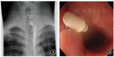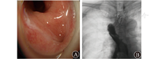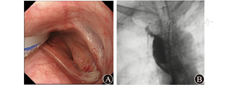 例1 患者男,55岁,因"进食后呛咳5个月余"于2018年4月10日入院。2017年9月患者因发现食管癌行食管癌根治术。术后偶有进食后呛咳。患者于2017年10月出现胸闷气喘,伴血氧饱和度下降。于当地医院行上消化道造影检查提示食管气管瘘。长期空肠营养管鼻饲饮食,间断抗感染治疗,其间患者因长期鼻饲饮食致能量严重摄入不足,体质量下降10 kg。2018年3月患者于江苏省人民医院行胃镜检查见吻合口局部有一直径约为3 mm的瘘道,瘘口周围黏膜光滑(图2A);上消化道造影检查提示食管气管瘘(图2B)。于2018年4月13日行内镜下OverStitch缝合术闭合瘘口,手术过程顺利,术中使用1根缝合线,缝合6针,总手术时间约为50 min。术后第2天予流质饮食,症状改善,于2018年4月16日出院。术后3个月复查胃镜和上消化道造影均提示瘘口已闭合(图3),患者无胸闷、气喘,无进食后呛咳,体质量增加约8 kg。