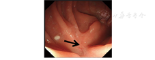 例2 患者女,60岁,因"恶心、呕吐1年"于2018年7月6日入院。2016年9月患者因发现贲门癌行腹腔镜下近段胃切除术和食管残胃空肠双通道吻合术。术后半年,患者恶心、呕吐症状逐渐加重,行胃镜检查提示盲端近吻合口处可见一瘘口(图4A),上消化道造影提示吻合口空肠瘘(图4B)。于2018年7月10日予内镜下OverStitch缝合术闭合瘘口,手术过程顺利,术中使用1根缝合线,缝合6针,总手术时间约为75 min。术后患者症状明显缓解,于2018年7月13日出院。术后3个月复查胃镜和上消化道造影均提示瘘口已完全闭合(图5)。