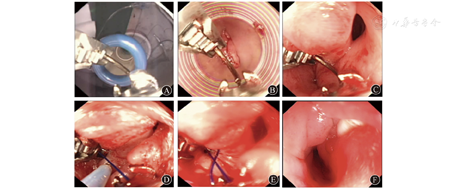 患者术前禁食8 h,告知患者手术风险,签署胃镜检查、内镜下OverStitch缝合术和麻醉知情同意书。内镜下治疗和OverStitch缝合术均由经过专业培训,且有5年以上内镜操作经验的江苏省人民医院内镜医师、护士和麻醉师配合完成。患者均接受气管插管和全身静脉麻醉,予20 mg丙泊酚静脉麻醉,0.1~0.5 mg·kg-1·h-1维持,咪达唑仑3~5 mg、必要时追加1~3 mg。使用单钳道白光内镜确定瘘口位置。使用内镜下氩离子凝固术(argon plasma coagulation, APC)灼烧瘘口周围黏膜。更换双钳道电子胃镜,将OverStitch内镜锁边缝合装置安装于胃镜头端,组织提拉器与缝合线分别置于2个钳道内。对瘘口进行连续缝合。释放缝线的头端,同时拔除组织提拉器,将缝合线闭合器放入钳道后,置于第1针处,释放闭合器,收紧缝合线。闭合后观察有无活动性出血(图1)。术后禁食24 h,术后第2天开始予流质饮食。住院期间给予抑酸、预防感染、补液等治疗,观察患者有无发热、腹痛、呕血和黑便,并监测生命体征。