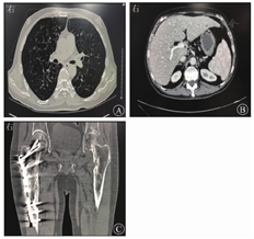 体格检查示体温为36.8 ℃,脉搏为92次/min,呼吸频率为20次/min,血压为131/98 mmHg,BMI为20.76 kg/m2;神志清楚,皮肤、巩膜黄染,无肝掌、蜘蛛痣;头顶部可见散在红色丘疹;左外耳道可见脓性分泌物,左侧颈后胸锁乳突肌后缘可触及1枚大小约0.5 cm×0.5 cm的淋巴结,质硬,表面光滑,有压痛,活动度可;双肺呼吸音清晰,未闻及干湿性啰音;心率为92次/min,律齐,各瓣膜听诊区未闻及杂音;腹平坦,无压痛、反跳痛和肌紧张,肝脾未触及;右股部可见一长约10 cm的手术瘢痕。入院血常规示白细胞计数为9.59×109/L,中性粒细胞占比为0.799,血红蛋白为125 g/L,血小板计数为456×109/L。尿常规检查示尿比重值为1.004,尿渗透压为68 mOsm/(kg·H2O)。粪便常规、凝血常规检查均未见异常。ESR为70 mm/1 h,超敏CRP为104.8 mg/L。感染相关指标如结核分枝杆菌、布鲁氏菌、伤寒沙门菌等细菌或真菌均呈阴性。肝功能检查示TBil为82.00 μmol/L,DBil为44.4 μmol/L,白蛋白为31.2 g/L,ALT为25 U/L,AST为30.0 U/L,ALP为910 U/L,GGT为287 U/L,总胆汁酸为18.4 μmol/L;肾功能、电解质、心肌酶、血糖、血脂均未见异常。病毒性肝炎标志物均呈阴性。自身抗体[包括抗核抗体、抗干燥综合征A(Sjögren syndrome A,SSA)抗体等]、抗线粒体抗体(anti-mitochondrial antibody,AMA)、AMA-M2、风湿因子均呈阴性。免疫球蛋白(immunoglobulin,Ig)G、IgM、IgA均无异常,补体C3为2.02 g/L,补体C4为0.41 g/L。CA125为37.2 U/mL,铁蛋白为244.72 μg/L。甲状腺功能3项(促甲状腺激素、游离甲状腺素和游离三碘甲状腺原氨酸)检查均无异常。垂体激素6项(促甲状腺激素、促卵泡生成素、促黄体生成素、促肾上腺皮质激素、生长激素、泌乳素)检查示,促甲状腺激素为7.020 mU/L,泌乳素为19.76 μg/L,余4项指标均无异常。腹部超声提示肝大,肝回声增粗;肝右叶囊肿;脾大。胸部CT平扫检查示两肺内多发大小不等的囊性病变,部分融合,两肺内散在慢性炎症性病变;左侧第6肋骨局部小类圆形异常密度影(图1A),性质待定。肺功能检测示中度阻塞性通气功能障碍,轻度限制性通气功能障碍,重度弥散功能下降。上腹CT平扫和增强CT检查示肝实质内多发低密度影(图1B),性质待定,暂考虑囊肿可能性大;肝门区和腹膜后多个淋巴结,部分稍大;胆囊壁稍增厚,胆汁淤积。骶髂关节CT平扫检查示符合右股骨术后改变,右股骨骨质密度欠均匀;左侧髋臼和左股骨多发骨质破坏伴周围软组织影(图1C)。