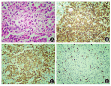 入院后嘱患者卧床休息,低盐、低脂饮食,口服熊去氧胆酸胶囊(0.25 g/次,3次/d)、静脉推注丁二磺酸腺苷蛋氨酸(1 g/次,1次/d)行保肝利胆治疗4周,静脉滴注哌拉西林他唑巴坦(4.5 g/次,2次/d)行抗感染治疗,静脉滴注氨溴索(30 mg/次,2次/d)行祛痰治疗2周,患者食欲不振、黄疸、咳嗽、咳痰等症状均减轻,体温维持在37 ℃左右。于2017年2月24日经血液内科、免疫风湿科、影像科、呼吸内科、骨科、内分泌科、皮肤科等多学科会诊,建议通过胸腔镜检查或开胸活检、骨骼病变穿刺或手术、肝脏穿刺、皮肤活检,或向河北医科大学第三医院(患者12年前曾于该院就诊)借阅病理切片行免疫组织化学等检查明确诊断。患者及其家属拒绝有创操作,选择向河北医科大学第三医院借阅病理切片,并于2017年3月16日复做H-E染色和免疫组织化学染色,结果示常规病理形态和免疫表型符合LCH,CD1α阳性(+),CD68阳性(+),溶菌酶散在阳性(+),S-100阳性(+),波形蛋白阳性(+),胎盘碱性磷酸酶(placental alkaline phosphatase,PLAP)阴性,Ki67阳性(为10%)(图2)。患者LCH诊断明确后,转血液内科进一步诊治,但因拒绝基因检测和化学治疗,于2017年3月22日自动出院。随访患者未行进一步检查和诊治,于2018年死亡。