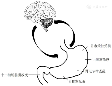 传统认为FD和胃轻瘫是胃动力障碍疾病。但是,近年来有研究发现,除了胃动力障碍,FD和胃轻瘫的病理生理机制还包括胃容受性受损和内脏高敏感。机理研究发现,FD的病理生理机制还有十二指肠因素的参与,例如十二指肠黏膜改变;胃轻瘫的病理生理机制还包括巨噬细胞的分子机制等。