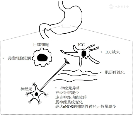 胃轻瘫具有多种细胞的病理学改变,包括间质卡哈尔细胞( interstitial Cajal cell,ICC)缺失、肌层纤维化、肌层神经元周围炎性细胞浸润、神经元异常等(图2)。有研究采用全层胃体活组织检查发现,糖尿病胃轻瘫和特发性胃轻瘫患者存在ICC缺失[21]。糖尿病胃轻瘫和特发性胃轻瘫患者的ICC缺失可能会导致胃排空延迟,损害胃的起搏活动和运动协调性[22],但尚不清楚ICC缺失是否可以预测胃轻瘫症状的严重程度。肌层纤维化,特别是神经元周围的纤维化是特发性胃轻瘫另一超微结构特征,这些纤维层可能损害平滑肌的新陈代谢,并引起细胞损伤[23]。有2项研究结果显示,某些胃轻瘫患者肌层中有异常嗜酸性粒细胞或巨噬细胞浸润[24,25]。研究发现,糖尿病和特发性胃轻瘫患者胃组织中CD206阳性细胞和抗炎性M2型巨噬细胞数量减少,并与ICC的缺失有关[26]。另一项研究发现促炎性M1型巨噬细胞在胃轻瘫组织中的基因表达增加[27]。巨噬细胞引起的免疫失调和氧化应激损伤是导致ICC缺失和胃排空延迟的关键因素[2]。胃轻瘫的神经元异常包括神经纤维减少、迷走神经功能障碍、肠神经系统变化以及表达神经型一氧化氮合酶(neuronal nitric oxide synthase, nNOS)的抑制性神经元数量减少[28]。