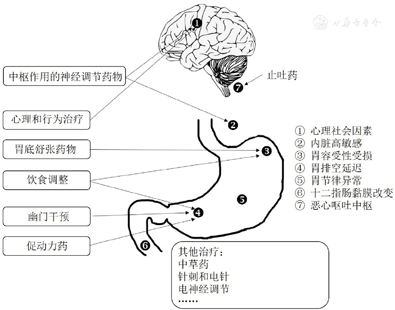 FD和胃轻瘫存在多个病理生理机制和病因,针对不同的病理生理机制有不同的治疗选择,如图3所示。临床医师应特别注意对于不同病理生理机制导致多种症状的患者。例如,如果患者同时有胃容受性下降(例如早饱)和胃窦收缩受损(例如餐后饱胀和腹胀等症状),那么选择何种治疗方法可能会有争议,选择肌肉松弛剂能改善胃容受性,但可能会加重因胃窦动力受损而引起的症状,反之亦然;内脏性疼痛和胃窦动力障碍的症状会并存,大多数止痛药物(如阿片类药物)会加重动力障碍。针对这种情况,应考虑采用综合治疗,中医可能提供更好的解决方案。