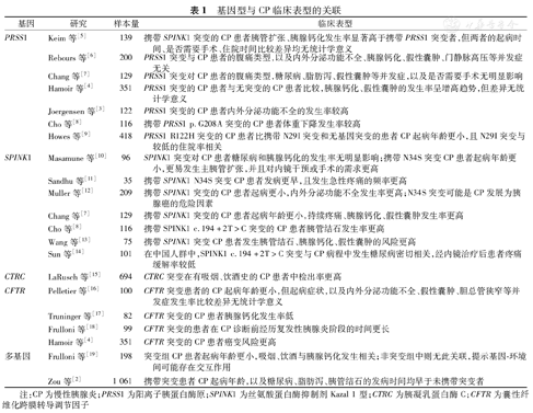 | SPINK1 | Masamune等[10] | 96 | SPINK1突变对CP患者糖尿病和胰腺钙化的发生率无明显影响;携带N34S突变CP患者起病年龄更小,更易发生主胰管扩张,并且对内镜干预或手术的需求更高 |