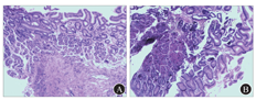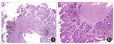 患者女,52岁,因"腹胀、嗳气等上腹部不适,加重1个月"于2018年3月13日就诊于空军军医大学西京医院消化内科门诊。查13C-尿素呼气试验(13C-urea breath test,13C-UBT)阳性,予以阿莫西林联合克拉霉素的铋剂四联疗法进行根除治疗。2018年4月27日复查13C-UBT仍为阳性,提示幽门螺杆菌根除治疗失败;于2018年5月27日行包含呋喃唑酮联合四环素在内的铋剂四联方案进行补救治疗。2018年7月3日,复查13C-UBT阴性,提示幽门螺杆菌根除成功;行胃肠镜检查提示慢性萎缩性胃炎,以胃体为著;肠镜检查未见异常。患者排便量少,上腹部不适稍有缓解,无腹胀,继续给予雷贝拉唑、马来酸曲美布汀胶囊、复方消化酶等对症治疗后好转。患者平素体健,无高血压、糖尿病等慢性病史,无吸烟、饮酒史,其父既往诊断为胃癌。鉴于患者为胃癌患者的一级亲属,嘱其1年后复查胃镜和病理活体组织检查(以下简称活检),重点关注胃体变化。2019年5月13日,患者在空军军医大学西京医院复查13C-UBT提示阴性,胃镜检查结果(图1)提示胃黏膜欠光滑,以胃体部明显,色泽相间明显,黏膜下血管纹透见,散在点片状糜烂和陈旧性出血斑;胃体、胃角和胃窦部多发灰白色微隆起,部分表面略凹陷、发红,窄带内镜观察见亮蓝嵴样改变,多系肠化生。分别在胃体上段大小弯侧、胃角和胃窦大小弯侧取材,组织质软、蠕动正常,黏液湖微浊。病理检查结果(图2)提示胃体上部大小弯侧出现黏膜中度慢性炎,重度萎缩,重度肠化生;胃角和胃窦部大小弯侧黏膜出现中度慢性炎,中度萎缩,轻度肠化生。胃炎评价系统(operative link on gastritis assessment, OLGA)/基于肠化生的胃炎评价系统(operative link on gastritis assessment based on intestinal metaplasia, OLGIM)分期为Ⅳ期/Ⅲ期。诊断:慢性萎缩性胃炎伴重度肠化生。患者伴有腹胀、嗳气等上腹部不适,予以口服羔羊胃提取物维B12胶囊(新疆生化药业有限公司,55 U/粒,2粒/次,3次/d)治疗。治疗1个月后,于2019年6月18日复诊,患者腹胀、嗳气等上腹部不适症状较前明显改善,嘱其坚持羔羊胃提取物维B12胶囊治疗。治疗半年后,于2019年12月11日复查13C-UBT呈阴性。胃镜检查结果(图3)提示贲门下大弯侧可见片状黏膜浅凹陷,底无苔,边缘黏膜尚光滑,略充血,取材处组织质软;胃体下段小弯侧可见片状黏膜微隆起,顶端糜烂,取材处组织质软;余胃黏膜尚光滑,柔软,色泽红白相间,窦部散在点片状黏膜红斑,蠕动可,黏液湖微浊。2019年12月11日病理活检结果(图4)提示胃体下段黏膜中度慢性炎,轻度急性活动,中度萎缩,中度肠化生,小凹上皮增生;贲门黏膜慢性炎急性活动,小凹上皮增生伴中度肠化生;胃窦、胃角黏膜轻度慢性炎,轻度急性活动,轻-中度萎缩;胃体上段黏膜轻度慢性炎。OLGA/OLGIM分期为Ⅲ期/Ⅱ期。诊断:慢性萎缩性胃炎伴肠化生。患者胃黏膜萎缩和肠化生程度较前减轻,嘱其继续口服羔羊胃提取物维B12胶囊治疗,半年后复查。因疫情影响,患者2020年6月未按时复诊,坚持羔羊胃提取物维B12胶囊治疗至2021年3月。2021年3月30日复查13C-UBT阴性。胃镜结果(图5)提示贲门局部黏膜充血;余胃黏膜柔软欠光滑,以胃体小弯侧明显,色泽红白相间明显,黏膜下血管纹透见,蠕动正常,黏液湖微浊。分别于胃体上段大小弯侧、胃角和胃窦部大小弯侧取材,组织质软。病理活检结果(图6)提示胃窦、胃角黏膜中度慢性炎,轻度急性活动,轻度萎缩,小凹上皮增生;胃体黏膜轻度慢性炎。OLGA/OLGIM分期为Ⅰ期/0期。诊断:慢性萎缩性胃炎,贲门炎。经羔羊胃提取物维B12胶囊治疗1年半,患者胃黏膜OLGA分期从Ⅳ期降至Ⅰ期,OLGIM分期从Ⅲ期降至0期,提示羔羊胃提取物维B12胶囊能有效降低CAG伴肠化生患者的OLGA和OLGIM分期,并有可能降低患者的胃癌发病风险。