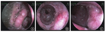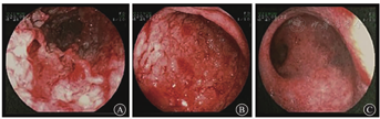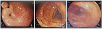 入院后予以美沙拉秦缓释颗粒(2 g/次,2次/d)抗炎、中/长链脂肪乳注射液(250 mL/d)+混合糖电解质注射液(500 mL/d)+复合磷酸氢钾注射液(2 mL)等营养支持治疗;患者外院抗感染、抗病毒、糖皮质激素治疗数月,腹泻、脓血便症状明显改善,但每次糖皮质激素减量后,症状出现反复,考虑为糖皮质激素依赖,遂转换为生物制剂治疗。经与患者沟通、协商后,于2020年9月28日予以IFX治疗,患者体重为58 kg,治疗剂量为300 mg/次。患者腹泻、便血较前好转,遂出院,出院后继续口服醋酸泼尼松(早餐后口服,20 mg/次;晚餐后口服,10 mg/次),每2周减量5 mg,减量至20 mg/d时每2周减量2.5 mg。2020年10月22日患者进行第2次IFX 300 mg治疗;11月25日,因患者体重上升至66 kg,调整IFX剂量至400 mg。经3次IFX治疗后,患者腹泻、便血症状较前明显缓解,排便频率为2~3次/d,粪便性状为黄色成形软便。2021年1月,醋酸泼尼松减量至7.5 mg后患者开始间断出现腹痛、便血症状,于1月22日至空军军医大学西京医院消化内科复诊,查IFX血药浓度为1.0 μg/mL,抗IFX抗体浓度<4 ng/mL,肠镜检查(图6)示升结肠至乙状结肠见散在瘢痕,并见多发丘状或结节样、团块状隆起,黏膜粗糙,散在糜烂、溃疡,肠腔多段狭窄,镜身尚可通过;直肠散在点片状黏膜充血、糜烂,表面覆白苔,血管纹理模糊。肠镜检查结果较前好转,部分呈瘢痕愈合,降结肠狭窄较前改善。患者此次症状反复,考虑与IFX血药浓度较低有关,遂于2021年1月25日优化IFX剂量至500 mg治疗。因个人原因治疗时间延迟6周后,2021年5月14日患者于空军军医大学西京医院完成第5次IFX 500 mg治疗。2021年8月20日于当地医院完成第6次IFX 500 mg治疗。2021年9月电话随访,患者腹痛、腹泻、便血等症状较前明显缓解,排便频率为1~3次/d,无黏液脓血便,间断偶有腹痛,可耐受。