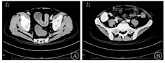 体温为36.3 ℃,脉率为84次/min,呼吸频率为16次/min,血压为124/76 mmHg(1 mmHg=0.133 kPa);神志清楚,全身浅表淋巴结无肿大,双肺呼吸音清,未闻及干湿性啰音,心率为84次/min,心脏瓣膜听诊区未闻及病理性杂音;腹部平坦,右侧腹部可见一长约10 cm陈旧性手术瘢痕,全腹无压痛和反跳痛,无肌紧张,肠鸣音未见异常。入院后血常规检查示白细胞计数为14.46×109/L,中性粒细胞计数为13.17×109/L,中性粒细胞占比为0.91;超敏C反应蛋白为14.1 mg/L,ESR为27 mm/1 h,白蛋白为35.3 g/L;粪便隐血试验和粪便白细胞均阳性;肠道菌群分布Ⅲ度失调;肝肾功能、甲状腺功能、自身抗体系列(抗核抗体、抗Sm抗体、抗双链DNA抗体、抗SSA抗体、抗Scl-70抗体、抗Jo-1抗体等)均未见明显异常;T-SPOT、CMV、EB病毒、艰难梭菌和粪便细菌培养均为阴性。2020年9月22日,患者复查肠镜(图3)示降结肠狭窄,黏膜粗糙,多发糜烂、溃疡,降结肠黏膜可见多发增生性指状突起,黏膜脆性增加,血管纹理紊乱,直肠病变较轻,内镜诊断为结肠溃疡,溃疡性质需结合病理检查结果判定。病理检查(图4)示慢性活动性肠炎,形态提示UC。2020年9月26日肠道双源计算机断层扫描(computed tomography,CT)(图5)检查示乙状结肠、降结肠、横结肠肠壁肿胀、增厚,黏膜强化,考虑为炎性改变、双肾萎缩、右侧髂窝移植肾。