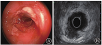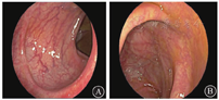 2021年4月19日完善小肠CT造影(computed tomography enterography,CTE)检查示降结肠与乙状结肠交界处可见节段性腔壁增厚、对称,管腔狭窄改变,并可见明显强化征象,未见明确分层和梳状征;所示空肠、回肠大部充盈扩张,未见明显腔壁增厚和管腔狭窄改变,未见明确异常强化征象;腹腔未见积气、积液(图2)。当日完善结肠镜+超声内镜检查,白光内镜下见直肠黏膜光滑,乙状结肠距肛门约20 cm以下可见多发不规则溃疡,伴自发性少量渗血,肠腔狭窄(图3A),无法通过,病灶处予多块深挖活检;超声内镜检查示乙状结肠局部肠壁增厚,最厚处约1.3 cm,肠壁层次结构模糊不清、呈较均匀低回声,浆膜层不完整,病变周围腹腔可见多发低回声区(图3B)。肠镜活检病理示乙状结肠黏膜表面糜烂,伴凝固性坏死,肠黏膜固有层内大量淋巴细胞增生,增生的淋巴细胞呈小到中等大小,可见异型细胞;免疫组织化学检查示增生的淋巴细胞以自然杀伤/T细胞为主,可见少量大B淋巴细胞,EB病毒编码区(Epstein-Barr encoding region,EBER)阳性,未见巨细胞病毒包涵体。