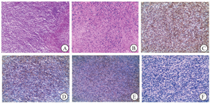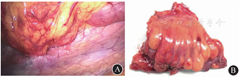 患者存在腹痛,内镜和CTE提示结肠管腔狭窄,符合消化道梗阻的表现;超声内镜提示局部乙状结肠浆膜层不完整,考虑存在慢性穿孔。血液内科会诊认为,根据内镜活检病理结果,倾向自然杀伤/T细胞淋巴瘤,如患者和家属同意,可外送至相关检验机构行基因重排检测以明确诊断。由于检测费用较高,患者表示拒绝。胃肠外科会诊认为,对于局限于肠道的病变,可行手术切除,有利于减轻肿瘤负荷,解除消化道梗阻,以及预防穿孔导致的继发腹腔感染等并发症,同时可以获得手术标本,有助于明确诊断。经患者和家属同意,于2021年4月27日行手术治疗。术中见肿块位于乙状结肠中段,大小约为5 cm×5 cm×2 cm,已突破浆膜层,外观呈灰白色,外周可见脂肪组织增厚(图4A),肝脏表面、胆囊、胃、脾、空回肠、盆腹腔表面光滑,未探及结节或肿块。遂行腹腔镜下乙状结肠根治切除+输尿管周围粘连松解+肾周松解术。手术标本可见溃疡,肠周见脂肪爬行征(图4B)。病理学检查结果示结肠黏膜溃疡形成,黏膜下淋巴样细胞增生,细胞呈中等大小,异型淋巴细胞增生(图5A),胞质透明,可见淋巴细胞浸润上皮,局灶坏死,伴血管炎改变;标本两切缘、环周切缘均未见肿瘤细胞;肠周围淋巴结见肿瘤细胞累及(1/10)。免疫组织化学染色结果(图5B~5F)示CD3、CD5、CD56、T细胞胞质内抗原1(T cell intracytoplasmic antigen 1,TIA-1)、颗粒酶B、EBER、CD20、CD79a、细胞周期蛋白D1(cyclin D1,CycD1)、CD38、CD138、CD68(KP-1)、免疫球蛋白κ链、免疫球蛋白λ链、广谱细胞角蛋白(pan cytokeratin,CK-P)均阳性,Ki-67(90%阳性),CD21阴性。术后病理诊断为乙状结肠非霍奇金淋巴瘤,结外自然杀伤/T细胞淋巴瘤;肿瘤侵犯脉管和神经,累及肠管全层达浆膜外脂肪组织。术后1周复查盆腹腔增强计算机体层成像示乙状结肠术后改变,吻合口结构欠清,壁稍增厚,周围渗出;腹腔少量游离积气。患者术后病情平稳,恢复良好。