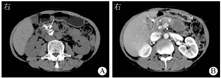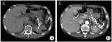 2019年8月7日入院体格检查示体温为36.5 ℃,脉率为78次/min,呼吸频率为20次/min,血压为120/80 mmHg(1 mmHg=0.133 kPa),精神尚可,可自行步入病房,神志清楚,无贫血貌,皮肤、巩膜轻度黄染,浅表淋巴结无肿大,心肺未见明显异常;腹平软,未见胃肠型和蠕动波,未见腹壁静脉曲张,中上腹轻压痛,无反跳痛,未扪及包块,肝脾肋下未扪及,墨菲征阴性,腹部叩诊鼓音,肝肾区无叩击痛,移动性浊音阴性,肠鸣音为4次/min,双下肢无水肿。血常规检查示白细胞计数为3.7×109/L,中性粒细胞占比为0.495,血红蛋白为101 g/L,血细胞比容为31.20%,血小板计数为336×109/L、超敏C反应蛋白为3.89 mg/L;血清淀粉酶为214 U/L。尿常规、粪常规+粪便隐血试验、肝肾功能、血清电解质、凝血功能、肿瘤标志物、甲状腺功能、自身抗体系列、免疫球蛋白G4、人类免疫缺陷病毒、梅毒螺旋体抗体均阴性。2019年8月7日上腹部CT增强扫描检查(图1、图2)提示慢性胰腺炎急性发作、胰腺多发结石,胰体尾部巨大假性囊肿,假性囊肿内脾动脉假性动脉瘤可能,脾囊肿。2019年8月8日磁共振胰胆管造影(magnetic resonance cholangiopancreatography,MRCP)示左右肝管、肝总管、胆总管粗细不均,局部显示不清,但未见扩张,其内未见明显充盈缺损,胰腺体尾部和脾门区见一长径约10 cm的类长圆形异常信号影,T1、T2加权像均呈混杂信号。脾脏外侧及其后方见一囊状水样信号,长径约7 cm。2020年10月13日入院体格检查示腹部有一长约10 cm手术切口,左侧脾窝穿刺引流管在位,引流液较少,腹软,腹部无压痛和反跳痛。血常规检查示白细胞计数为6.8×109/L,血清淀粉酶为196 U/L。假性囊肿引流液李凡他试验弱阳性,乳糜试验阳性,淀粉酶>12 000 U/L。上腹部CT增强扫描检查示慢性胰腺炎腹部术后,术区及其周围改变。