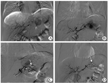 脾动脉假性动脉瘤破裂的症状、预后与出血位置密切相关,破入胰管者因会出现呕血、黑便等出血表现而较易早期诊断、及时治疗,而破入假性囊肿、腹腔或后腹膜者起病隐匿,发现时往往已出现血容量不足,预后不佳,死亡率高达90%[8,9]。因此,早期诊断和干预对于改善慢性胰腺炎并发假性动脉瘤患者的预后非常重要。常用干预手段包括介入栓塞、血管内支架、手术套扎、脾切除、远端胰腺切除等。介入治疗创伤小、操作便捷,适用于一般情况较差、血流动力学不稳定而无法接受麻醉和手术的假性动脉瘤破裂出血患者[10,11]。本例患者脾动脉瘤破于胰腺假性囊肿中,无明显临床表现,经及时介入栓塞出血动脉后未出现不良结局。
