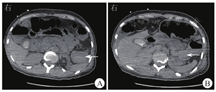 患者女,40岁,主因排"暗红色血便7 d,加重1 d"于2020年10月31日就诊于北京大学第一医院。患者7 d前无明显诱因排暗红色血便伴血块,就诊于某三级甲等医院,行胃镜检查示幽门管溃疡,结肠镜检查示直肠溃疡伴出血可能,但胃镜和结肠镜下皆未见活动性出血,内镜检查后仍有大量鲜血便排出;转诊至另一所三级甲等医院行内科保守治疗,给予200 mL氨甲环酸氯化钠注射液(每100 mL内含氨甲环酸0.5 g、氯化钠0.85 g)止血、4 U悬浮红细胞输注,患者仍间断排鲜红色血便,血红蛋白进行性下降;再转诊至第3所三级甲等医院行肠系膜下动脉+髂内动脉造影术,并予直肠上动脉小分支血管栓塞,后便血再次加重,遂转诊至北京大学第一医院急诊科。急查血常规示白细胞计数为9.56×109/L,红细胞计数为1.84×109/L,血红蛋白为57 g/L,平均红细胞体积为91.8 fL,平均红细胞血红蛋白含量为31 pg,平均红细胞血红蛋白浓度为337 g/L;血生物化学检测示丙氨酸转氨酶为9 U/L,天冬氨酸转氨酶为14 U/L,白蛋白为24.1 g/L,钾离子为3.23 mmol/L;凝血功能检测示凝血酶原时间为13.5 s,活化部分凝血活酶时间为25.8 s,国际标准化比值为1.17,纤维蛋白原为1.38 g/L,D-二聚体为0.29 mg/L;粪便常规检查示镜检红细胞满视野,粪便隐血试验阳性。2020年10月31日21:02行全腹部+盆腔计算机断层扫描(computed tomography,CT)平扫检查示结肠腔内可见稍高密度灶(图1A);胰尾部与结肠间可见一大小为48 mm×43 mm的类圆形病灶,病灶右部呈稍高密度,病灶左部呈稍低密度(图1B);直肠上段可疑增厚,盆腔少量积液。患者自述既往体健,孕2产1,月经规律,无胰腺炎和腹痛病史,未口服抗凝、抗血小板药。体格检查示体温为36.7 ℃,血压为117/71 mmHg(1 mmHg=0.133 kPa),心率为96次/min,呼吸频率为16次/min;神志清楚,精神可,贫血貌,腹软无压痛,无腹膜刺激征,肝、脾肋下未及,肠鸣音8次/min,墨菲征阴性,移动性浊音阴性。