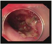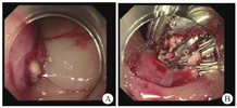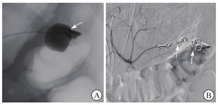 患者生命体征平稳,入院后未再次便血,暂予禁食水、补液、抑酸处理,给予200 mL氨甲环酸氯化钠注射液止血、2 U悬浮红细胞输注。2020年11月1日9:00复查血红蛋白为66 g/L,生命体征平稳,无便血,继续给予内科保守治疗并观察。11月2日4:22患者排大量(约500 mL)鲜血便,伴意识模糊,血压为57/35 mmHg,急查血常规示红细胞计数为0.85×109/L,血红蛋白为26 g/L,平均红细胞体积为93 fL,平均红细胞血红蛋白含量为30 pg,平均红细胞血红蛋白浓度为329 g/L。11月2日8:22急诊行第1次结肠镜检查,在直肠下段可见溃疡糜烂面,边界清楚,有黄苔附着,表面见大小约3.0 cm×2.5 cm的陈旧血块,未见明显活动性出血;进镜至回盲部观察3 min,未见血液从小肠流出;退镜过程中可见结肠腔内大量血凝块,反复冲洗未见新鲜出血(图2)。肠镜退出后20 min,患者再次排出大量(约500 mL)鲜血便,伴意识丧失。给予患者双通道加压补液、血管活性药物泵入、4 U悬浮红细胞输注、400 mL新鲜冰冻血浆输注后,收缩压上升至60~90 mmHg,意识稍有恢复。11月2日11:02急诊行全腹部+盆腔增强CT检查,动脉期、门脉期扫描示胰尾部与结肠间类圆形病灶明显强化,程度均与动脉相近,最大密度投影重建图像示病灶与脾动脉、结肠脾曲相连(图3A);延迟期扫描示结肠脾曲左侧肠腔内可见密度增高,提示肠腔内对比剂进入(图3B)。考虑脾动脉瘤破裂致结肠脾曲活动性出血。11月2日13:35行第2次结肠镜检查,进镜至结肠脾曲,可见黏膜隆起伴充血肿胀,顶端可见糜烂,有白色血栓头附着,未见活动性出血,以肠镜触碰血栓头可见鲜红色血液喷出(图4A);予以钛夹夹闭出血动脉,夹闭过程中可见大量活动性出血,6枚钛夹夹闭后暂无活动性出血(图4B)。结肠镜下止血后,患者仍持续排出少量血便(约80 mL/h),收缩压为80~100 mmHg。考虑动脉瘤破裂致结肠脾曲出血,钛夹止血不彻底,病因不能去除,仍有出血可能,遂于11月2日15:05行数字减影血管造影(digital subtraction angiography,DSA),可见脾动脉瘤样扩张,最大径为4.2 cm(图5A),证实为脾动脉真性动脉瘤,但未发现对比剂大量外渗,考虑因患者血压较低暂未出血或内镜下钛夹成功止血;在瘤体左侧可见结肠腔内的钛夹,证明存在脾动脉瘤结肠脾曲瘘。采用介入导管超选至脾动脉,置入6枚弹簧圈栓塞,再次造影未见对比剂溢出,动脉瘤不再显影(图5B)。11月3日患者排出少量血便,但生命体征平稳。术后1周复查增强CT示脾动脉栓塞术后,脾动脉瘤腔内未见对比剂进入,肠腔未见活动性出血。术后2周患者无便血、腹痛等不适,恢复进食后粪便常规和隐血试验均阴性,复查血红蛋白为97 g/L,康复出院。随访1.5年,患者未再便血,血红蛋白、血小板计数均在正常参考值范围内,粪便常规检查未见异常。