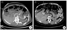 脾动脉瘤破裂致消化道出血是一类罕见、隐匿且凶险的疾病。经检索发现,本例患者为国内报道的第1例脾动脉真性动脉瘤破裂致下消化道出血病例。回顾国内外近20年关于脾动脉瘤破裂致消化道出血的68篇文献,共计73例患者,其中男57例(78.1%),女16例(21.9%),年龄为(51.67±15.01)岁,主要临床表现为腹痛、黑便、呕血和血便;脾动脉假性动脉瘤占58.9%(43/73),真性动脉瘤占27.4%(20/73),其余10例未获取病理标本且从影像学难以明确诊断。假性动脉瘤常见的原因为慢性胰腺炎(44.2%,19/43)和急性胰腺炎(18.6%,8/43),其他原因包括术后、肿瘤、外伤、结核、腹膜炎等,还有部分原因不明[6]。真性动脉瘤通常与血流量增加有关,如妊娠(特别是多胎)、原发性高血压、动静脉瘘或畸形、门静脉高压症等。脾动脉瘤破入消化道的部位包括胰管(38.4%,28/73)、胃(27.4%,20/73)、结肠(13.7%,10/73)、手术切口(4.1%,3/73)、十二指肠(4.1%,3/73)与位置不明(12.3%,9/73),值得关注的是上消化道出血占比较高,胰管、胃和十二指肠出血共51例,占69.9%。在治疗和预后方面,接受手术治疗的患者占43.8%(32/73),包括动脉瘤体切除,以及脾脏和受累脏器的部分切除、修补和吻合等,预后均较好。接受介入治疗的患者占39.7%(29/73),其中4例因介入术后再出血行手术治疗,1例介入栓塞治疗失败,1例出现严重的术后感染。9例患者明确病因后行内科保守治疗,均效果不佳。有2例患者在明确病因前即死亡,最终通过尸体解剖明确动脉瘤破裂诊断。1例患者明确病因后放弃治疗自愿出院,预后不详。