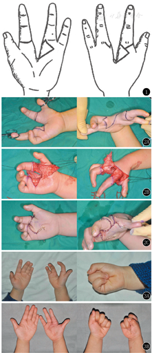 本组患儿均采用Ueba[7]术式。该术式共分为三个主要步骤。首先,在分裂畸形处设计三块皮瓣。分别是以环指侧方为蒂的指间皮瓣重建指蹼,以环指背侧皮肤为蒂的皮瓣覆盖手背创面,以及以示指掌侧皮肤为蒂的皮瓣覆盖手掌创面(图1)。其次,将示指序列截骨并向尺侧移位。掀起皮瓣时注意保护示指掌侧的血管神经束和背侧的指静脉。通常在第二掌骨基底处截骨,并将示指序列向尺侧移位至第三掌骨基底,适度旋后及调整手指长度后,克氏针固定;若无第三掌骨基底,可将完整的第二掌骨和示指序列向尺侧移位,重建第三腕掌关节。最后一个步骤是重建示指和环指间的掌骨头间深横韧带。Ueba[7]除在第二、四掌骨颈处将坚韧的软组织缝合以重建掌骨头间深横韧带外,还利用移植肌腱将示指和环指的伸肌腱装置进行并拢缝合。我们在实践中发现,经过掌骨截骨和移位旋转固定后,仅缝合掌骨颈处的坚韧软组织即能够达到矫正畸形的目的。因此本组病例未进行肌腱移植来加强重建的掌骨头间深横韧带。Ⅱ期和Ⅲ期病例在进行上述步骤的同时,需要将拇、示指进行并指分指,松解拇、示指间的纤维束带组织,局部皮瓣转移和(或)全厚皮片植皮开大虎口(图2)。术毕敷料包扎伤口,石膏固定患肢。