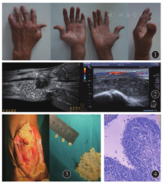 患者 男,67岁。因发现左腕、手部肿物约2年,加重并疼痛约1周入院。否认有腕部外伤、感染及肺结核等病史。近1周肿物增大较明显,症状加重。临床检查:左腕部可触及一大小约8 cm×7 cm肿物,局部肤温稍增高,有轻度压痛,表面光滑,与皮肤稍粘连,基底固定,活动稍受限,柔韧,腕关节活动受限,以屈伸受限为主,拇指远端呈鹅颈畸形,余各指指间关节不同程度畸形,指动稍受限,血运可,感觉稍麻木(图1)。彩超示:左侧腕管内屈肌腱周围大量关节液渗出(3级)、滑膜增生(3级)并滑膜炎(1~2级),类风湿?TB?(图2)。X线片示:左尺骨头骨质增生,腕关节软组织肿胀。结核菌素试验:(-)。MRI:考虑左腕关节慢性滑囊炎并米粒体形成;左腕关节退行性变(图2)。在臂丛神经阻滞麻醉下行左腕、手部肿物探查切除术。采取腕、掌部正中切口,切开腕管,见肿物为增生的滑膜囊组织,包膜较完整,至腕关节近端,沿屈肌腱周围生长,囊壁与屈肌腱粘连严重难以分离,经腕管内延伸至手掌部,内容物为大量黄色米粒状黄色小体及黄色粘稠液体。米粒体为胶囊样,切开内容为胶冻样物质(图3)。充分分离肿物与肌腱之间的粘连,清除肿物组织送病理检查,报告示:左腕滑膜组织增生,间质血管扩张、疏松水肿,淋巴细胞及浆细胞浸润,滑膜内可见大量钙化不均的嗜酸性无结构物质、软骨陷窝(图4)。术后第2天开始行左腕及掌指、指间关节功能锻炼;14 d拆线,左腕症状完全缓解,关节活动良好。随访至今未复发。