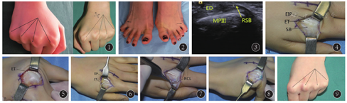 患者 女,24岁,右利手,12岁时无意中发现双手握拳时示、中、环、小指掌骨头水平各有一条索状结构滑向尺侧凹陷内,双足小趾背伸时各有一条索状结构滑向腓侧凹陷内,伴弹响,无明显疼痛及活动受限,仅手部频繁握拳后出现局部不适症状,未系统诊治。无外伤史。3年前患者开始从事轻体力劳动,出现手部疼痛症状,伴抓握无力,影响日常工作、生活,遂前来就诊。专科体格检查:双手掌指关节处无明显肿胀,主动屈曲掌指关节、指间关节90°时,示、中、环、小指伸肌腱在掌骨头水平向尺侧滑脱(图1),伸指后可自行复位,伴弹响,滑脱后患指掌骨头局部疼痛,按视觉模拟评分法(visual analogue scale,VAS)左、右手均为3分,掌骨头背侧压痛。双手各患指掌指关节主动活动范围及握力无明显降低。双足小趾主动背伸达30°时,小趾伸肌腱向腓侧滑脱(图2),伴弹响,无疼痛。手、足部各关节无韧带松弛症体征。双手浅表局部彩色多普勒超声结果显示:示、中、环、小指桡侧矢状束连续性存在,回声减低、变薄,较薄处厚度为0.3 mm;尺侧束无挛缩,回声正常(图3)。类风湿因子,C反应蛋白,红细胞沉降率结果无异常。于局部麻醉下行伸肌腱部分腱束套索桡侧侧副韧带固定术。术中使用上臂止血带,取左示、中指掌指关节桡侧纵行切口。逐层切开皮肤、皮下组织,显露伸肌腱及腱帽,见示指伸肌腱、中指伸肌腱桡侧矢状束连续,明显薄弱、拉长,近侧1/2缺失。当掌指关节及指间关节主、被动屈曲90°时,示指固有伸肌腱、中指伸肌腱向尺侧滑脱,未见关节囊撕裂,尺侧矢状束无粘连及挛缩。取示、中指伸肌腱桡侧腱束,宽约0.5 cm,以远端为蒂,近侧切断,向远端分离至腱帽近端水平,腱束长约3 cm,切开伸肌腱桡侧矢状束,显露掌指关节桡侧侧副韧带,腱束游离端由远端向近端套索该韧带,翻转后缝合至伸肌腱腱帽。调整腱束张力,嘱患者主动全范围屈伸患指时,伸肌腱稳定,无滑脱,屈曲掌指关节、指间关节无受限(图4,图5,图6,图7,图8)。重新紧缩修复切开的桡侧矢状束。逐层闭合创口。于指间关节伸直、掌指关节屈曲60°、腕关节背伸30°位支具外固定1个月,拆除外固定后逐步进行理疗,主、被动功能训练。术后2.5个月患者重返工作,无复发,无并发症发生。术后6个月随访,患者左手临床症状明显改善。左示、中指掌指关节水平手术创口愈合良好。左手主动屈曲掌指关节、指间关节时示、中、环指伸肌腱未见滑脱,无弹响,无疼痛,无掌骨头压痛;而小指伸肌腱仍存在尺侧滑脱,伴弹响,无疼痛,无掌骨头压痛(图9)。左示、中、环、小指主动活动范围无受限,握力较术前提高。