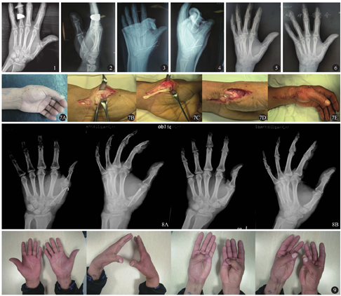 患者,男,56岁,7个月前摔伤致左拇腕掌关节肿胀、疼痛,当地医院诊断左拇腕掌关节半脱位,急诊行闭合复位克氏针固定、石膏外固定。石膏固定6周,克氏针固定6周,拔除克氏针后再次脱位,未治疗。5个月后来我院就诊,X线片示:拇指腕掌关节半脱位(图1,图2,图3,图4,图5,图6)。临床检查:左拇指腕掌关节可见隆起,活动后疼痛,对掌对指、外展功能受限,予左拇腕掌关节脱位切开复位、韧带重建术。手术选择改良Wagner掌侧入路,在近端向远侧腕横纹尺侧延伸,显露第一腕掌关节,注意保护神经,骨膜外分离鱼际部肌肉,切开掌侧及桡侧关节囊,暴露关节,见关节软骨少许损伤。在腕横纹处辨认桡侧腕屈肌腱,将鞘管切开至大多角骨水平,于桡侧腕屈肌腱近端约10 cm处,分段切取1/2桡侧腕屈肌腱(有取腱器可以小切口取腱),保留远端止点。在掌骨基底韧带止点水平,做矢状面方向与拇指指甲垂直的骨隧道,先应用直径1.5 mm克氏针钻孔,逐渐扩大到2.5 mm,可以通过肌腱为止,编织好的肌腱穿过骨隧道,由背侧引出,直视下拉紧,复位第一掌骨,调整好张力后,肌腱缝合到背侧骨膜,再将肌腱经拇长展肌止点下面绕过,在这个部位将肌腱关节囊缝合加强,然后再绕过桡侧腕屈肌腱的止点反折到第一腕掌关节囊桡侧,缝在第一掌骨基底骨膜上。克氏针固定关节,注意不要使重建的韧带张力过大影响关节活动(我们的方法为术中将肌腱断端临时固定,看患者手掌是否可以完全张开一个平面,拇指是否可以完全伸直)。然后缝合大鱼际肌,逐层缝合切口(图7)。术后石膏托固定腕关节于背伸20°、拇指腕掌关节伸直外展位、掌指关节屈曲20°,4周后拔除克氏针,拆除石膏,在康复治疗师的指导下开始关节活动康复,术后8周开始力量训练,包括捏力和握力训练。术后3个月内拇指避免强度较大的活动。随访患者6个月后无疼痛,无功能受限,回到以前的工作岗位,12个月后拇指活动范围无受限,无不稳、无疼痛。放射线检查未见半脱位但可见早期骨关节炎表现(图8,图9)。