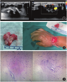 患者 女,73岁,发现右腕桡背侧肿物1年,逐渐增大伴虎口部麻痛3个月入院。临床检查:右腕部皮肤完整,无静脉曲张,皮温不高,腕关节桡背侧一皮下肿物,与皮肤无明显粘连,质韧,触压可引起腕部疼痛及虎口处麻痛,Tinel征阳性。右手各手指屈伸正常,腕关节屈曲时引起疼痛。超声检查:右腕部伸肌腱后方约28 mm×18 mm×12 mm的片状低回声,边界清,周边可见血流信号(图1)。于臂丛神经阻滞麻醉下手术,采用横切口进入,显露桡神经浅支,见其于肿物凸起部受压,轻度充血水肿,与肿物包膜轻度粘连。显微镜视下仔细分离并部分松解,解除肿物对神经的压迫。肿物大部分位于拇长屈肌腱和桡侧腕长、短伸肌腱下方并与之相连,呈分页状,于鼻烟窝处突出位于皮下。肿物包膜较薄,为灰白色质韧实性肿块,表面光滑,小血管丰富。逐步分离肿物至基底部,见肿物于腕背关节囊粘连,将肿物连同部分关节囊一并取下(图2)。病理诊断:右腕部腱鞘纤维瘤(图3)。术后3个月随访肿物无复发,虎口部感觉恢复正常达S3+,桡神经浅支走行区Tinel征阴性,右腕屈伸正常。