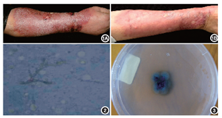 治疗:口服伊曲康唑400 mg/d,治疗期间每月复查肝功能,治疗2个月后溃疡愈合,皮损面积缩小(图1B),继续伊曲康唑400 mg/d治疗,目前仍在治疗随访中。
