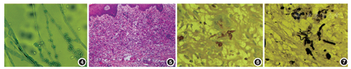 皮损组织病理检查:棘层肥厚,真皮层肉芽肿性炎症,可见以中性粒细胞为主的混合性炎症细胞,大量多核巨细胞(图5)。PAS染色(图6)及GMS染色(图7)可见大量孢子和菌丝,抗酸染色阴性。