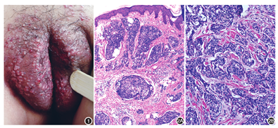 患者女,35岁,因外阴肿胀半年,发生淡红色丘疹结节1个月就诊。半年前,患者大阴唇出现肿胀,无痛痒,就诊前1个月表面出现红斑、丘疹、结节,并逐渐增多。患者自述4年前因宫颈癌于无锡市妇幼保健院行全子宫切除+双附件移位+盆腔淋巴结清扫术+腹主动脉旁淋巴结切除术,术后病理诊断为宫颈鳞状细胞癌2~3级,癌肿累及宫颈全层,上达子宫腔下段,脉管内见癌栓,左右盆腔淋巴结内见转移癌,术后行化疗和放疗,2年后患者无任何不适,胸腹部B超及CT检查未见可疑病灶。外阴部发病前无感染外伤史,否认家族史。各系统检查未见异常。皮肤科检查:外阴两侧阴唇弥漫性肿胀,表面有密集的大小不一的丘疹、结节或斑块,质地较硬(图1)。实验室检查:血尿常规、肝肾功能均正常。皮损组织病理:肿瘤组织位于真皮内,呈巢状或团块状,细胞异形,核大,深染(图2A,图2B)。免疫组化检查示肿瘤细胞P63蛋白及P16蛋白胞核阳性,上皮细胞膜抗原(EMA)胞质阳性,细胞角蛋白5/6部分阳性,ki-67 > 80%阳性,细胞角蛋白20阴性,提示肿瘤细胞为上皮来源,并为宫颈鳞状上皮来源,增殖指数高。结合临床诊断为:宫颈鳞状细胞癌外阴转移。遂请妇产科会诊后转上海肿瘤医院治疗,初期以放疗为主,配合化疗,皮疹有所改善,后失访。
