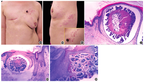 患者女,51岁。因右乳腺癌术后8年、左乳腺癌1年、左侧胸壁皮疹6个月于2014年9月来我科就诊。8年前于外院行保留乳房的右乳腺癌切除术,术后行5次化疗。3年半前右乳腺癌复发,在我院外科行右乳腺癌改良根治术。1年前发现左乳头内陷,于我院行乳腺MRI示:右乳术后改变;左侧乳腺癌(浸润性导管癌可能性大),左侧腋窝淋巴结转移。在我院外科行乳腺粗针穿刺,病理报告:乳腺浸润性导管癌Ⅱ级(1 cm × 0.5 cm × 1 cm);免疫组化:雌激素受体(ER)和孕激素受体(PR)均弱阳性(+),人类表皮生长因子受体2(C-erbB-2)(++),细胞角蛋白5/6(CK5/6)、表皮生长因子受体(EGFR)均阴性。诊断:左乳浸润性导管癌Ⅲc期(T4cN3M0),左侧腋窝淋巴结转移。在我院肿瘤科行多西他赛联合表阿霉素方案化疗6个周期,化疗结束后口服来曲唑片。6个月前发现左侧胸壁出现散在淡红色丘疹,无自觉症状,未理会。3个月前左前胸壁出现一个红色结节并逐渐增大,碰破后易出血,曾在外院疑诊化脓性肉芽肿。