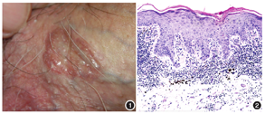 GP通常发生于男性,但亦有发生在女性外阴的报道[4],临床表现与经典PK类似,多数患者伴瘙痒[5]。本病需与发生在阴茎的环状扁平苔藓相鉴别,二者均表现为环状红斑伴有瘙痒,组织病理均有真皮浅层淋巴细胞为主的慢性炎症细胞呈带状浸润,但本病还有角化不全柱,并且基底层无液化变性,可与之鉴别。