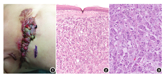 患者女,54岁。因右侧乳腺癌根治术后10年,胸壁瘢痕处新生肿块、结节3个月入院。10年前患者因右侧乳房肿块就诊于当地医院,诊断乳腺癌,行乳腺癌经典根治术,术后组织病理诊断为浸润性乳腺小叶癌。术后半年患者刀口愈合处出现瘢痕增生,表现为表面光滑质硬的条状斑块,未予特殊重视。近3个月来,胸壁瘢痕处出现新生结节及肿块,生长迅速,并伴有破溃、糜烂及出血。否认内科疾病及其他肿瘤病史。体检:患者一般情况可,右侧乳房缺如,右侧胸壁可见长约20 cm弧形手术瘢痕,表面可见密集融合成块的结节及肿块,表面可见破溃出血及脓血痂(图1)。皮下可触及多发性肿块,大小不等,活动度差,质硬。入院后完善相关检查,血尿粪常规未见异常。彩超示:双侧腋窝及锁骨上可见多发低回声结节,最大21.7 mm × 8.7 mm。分别于胸壁瘢痕表面及皮下肿块取材行组织病理检查:真皮内可见大量异形肿瘤细胞弥漫性浸润,肿瘤细胞核大深染,核仁明显,核分裂相易见,部分区域可见腺腔样分化的肿瘤细胞(图2、图3);免疫组化:C-erbB-2(++)、细胞角蛋白(+)、雌激素受体(-)、巨囊性病的液状蛋白15(+)、Ki-67(50%+)、孕酮受体(-)、TTF-1(-)。病理诊断:转移性或浸润性低分化癌。