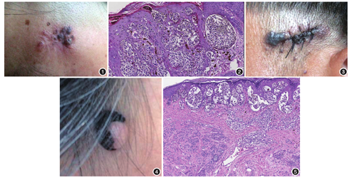 例1 男,46岁,自幼左额部有一绿豆大小黑色丘疹,随年龄增长缓慢增大。近6个月来,皮损无明显诱因迅速增大,伴瘙痒,皮损周边出现数个黑色斑丘疹。患者自发病以来无发热、乏力等不适,体重无明显减轻,否认其他内科疾病,家族中无类似疾病史。体检:各系统检查未见明显异常。全身浅表淋巴结均未触及肿大。皮肤科检查:左额部见1 cm × 1 cm黑褐色浸润性斑块,界清,质硬,边缘不规则,表面色素分布不均匀,无破溃、渗出。周边散在数个0.3 cm × 0.3 cm大小的黑色斑丘疹及不规则活检术后瘢痕(图1)。黑色斑块组织病理检查:表皮萎缩变薄,角质层内见黑素颗粒,表皮真皮交界处见大小不等、分布不均的黑素细胞巢,细胞内含有色素,部分细胞有异形改变,可见黑素细胞向表皮上部扩散;真皮内见黑素细胞增生,呈片状或巢状生长,细胞异形明显,未见成熟现象,皮损底部见多数核分裂象(图2)。周围斑丘疹组织病理:表皮萎缩变薄,未见交界活性,真皮上部见黑素细胞增生,呈巢分布,细胞有异形改变,未见成熟现象。PET-CT检查未见明显转移灶。诊断:先天性色素痣恶变。治疗:明确诊断后皮损予以扩大2 cm切除。1年后患者背部出现一黄豆大小肤色结节,组织病理证实为转移性黑素瘤,其后手术切除,并予以干扰素治疗,目前随访中。