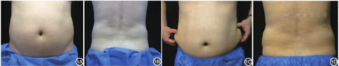 患者男,49岁,因腰腹部肥胖10年余就诊。患者既往有高血压病史,现服用缬沙坦氨氯地平片(倍博特)每天1片。体检:体型偏胖,尤双侧腰部、下腹部皮下脂肪明显肥厚,腰围96 cm,体重指数27.3。给予患者左侧腰部局部冷冻减脂治疗[美国酷塑(CoolSculpting®)技术],选取2个治疗点,用Coolcurve冷冻治疗头,使用制造商推荐的参数,仅治疗1次。治疗后即刻出现中度红斑、水肿、挫伤、麻木和刺痛,除麻木持续1个月,其他反应多在2周完全恢复。术后1个月,左腰部脂肪减少,2个月时治疗区域出现渐进式、压痛的异常隆起的皮下组织增生,质地稍硬,皮肤外观正常,并稳定增长至5个月,之后无明显变化。治疗期间患者生活习惯及饮食结构保持不变。治疗后9个月局部体检:左侧腰部皮下可见对应治疗区域的长方形的、明显隆起的皮下局限性斑块,质地较周围脂肪组织硬,触之可移动,无明显压痛,边界清楚。表面皮肤无变化(图1)。腰围97.5 cm,较治疗前增加1.5 cm。体重指数仍为27.3。辅助检查:皮肤高频超声仪检查显示,与治疗前相比,治疗区皮下脂肪层的平均厚度增加16.4 mm。