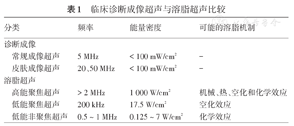 超声波具有可聚焦性、组织穿透性及能量沉积性,临床使用不同频率和能量密度的超声进行诊断和治疗。诊断成像所用超声为低能超声,能量密度一般为20 mW/cm2,频率5 MHz,而皮肤成像超声常为高频和超高频,分别为20和50 MHz。超声溶脂一般采用频率偏低(0.2 ~ 2 MHZ)而能量密度更高的超声,又可分为高能聚焦超声、低能聚焦超声和低能非聚焦超声,见表1。