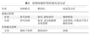 射频也称为射频电流,是一种高频交流电磁波的简称,其频率范围是3 kHz ~ 30 GHz。射频加热皮肤组织的模式有2种[29]:焦耳加热和偶极子加热,见表2。无论单极、双极或多级,常规接触式无创射频主要工作原理是焦耳加热,射频波每秒交变次数高达数千万次,靶组织中极性水分子在交变电场作用下高速旋转,相互摩擦产生热量,从而加热胶原组织。但脂肪细胞本身水分含量极少,基本绝缘,故热效应并不明显。而有创射频是将电流直接连通于两极间,当一极位于脂肪层、另一极位于皮表时,可用于辅助吸脂。非接触式射频作用原理[30]则是偶极子加热。脂肪组织有很多相反电荷的原子称为偶极子,偶极子的随机分布使脂肪组织透电率低、绝缘。射频治疗过程中偶极子被迫快速改变方向,以保持与射频振动区域极性相反。偶极子之间相互碰撞产生动力性热能量,但仅局限在低透电率组织如脂肪组织。