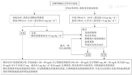 1.初始治疗(初始糖皮质激素剂量):轻度患者(PDAI 0 ~ 8)0.5 mg·kg-1·d-1,中度患者(PDAI 9 ~ 24)1.0 mg·kg-1·d-1。如果1周内没有控制病情,糖皮质激素剂量均升至1.5 mg·kg-1·d-1;重度患者(PDAI ≥ 25)1.5 mg·kg-1·d-1。除冲击治疗外不再增加糖皮质激素剂量,并同时应用免疫抑制剂。对于糖皮质激素联合利妥昔单抗治疗的患者,建议中度患者泼尼松0.5 mg·kg-1·d-1,重度患者1.0 mg·kg-1·d-1。