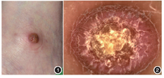 患者女,45岁,左下肢近踝部出现暗红色孤立肿物5个月,无明显主观症状,近1月余生长迅速。患者既往体检,无系统疾病及恶性肿瘤病史,家族中无恶性肿瘤病史。体检:左下肢近踝部见一肿物,暗红色,表面糜烂结痂,直径0.8 cm,边缘整齐,周边未见卫星灶,见图1。皮肤镜下肿物中央可见鳞屑、结痂,周边见少量袢状血管结构,见图2。