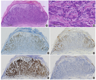 组织病理检查:肿瘤整体对称,两侧表皮突抱球样改变,真皮浅层痣细胞呈巢状分布,深层痣细胞呈索条状分布,少量呈巢状分布,无病理性核分裂象,见图3。免疫组化(图4):Melan-A阳性,表皮及真皮上层呈巢状分布的上皮样细胞和肿瘤下部呈巢状分布的部分梭形细胞HMB-45、P16阳性;Ki-67 10%阳性,主要表达于真皮浅层呈巢状分布的细胞。