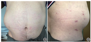 患者男,59岁,带状疱疹3周、右腰腹部膨隆2周余于2018年9月23日就诊。患者3周前无明显诱因右腰腹部出现单侧、带状分布的红斑、水疱,伴阵发性疼痛,外院就诊后服用抗病毒药物(具体不明)治疗,皮损好转,疼痛缓解。皮损出现6 d后,患处腰腹部出现局限性膨隆。患者自诉无腹胀、腹痛及便秘等症状,情绪激动时腹部膨隆增大。患者既往体健,否认高血压、糖尿病史及手术史。体检:右腰腹部第9~11胸椎对应皮区散在簇集米粒至黄豆大小红斑和色素沉着斑,沿右侧肋间神经呈带状分布,不过中线;对应皮区明显凸起,直径约15 cm,未扪及皮下肿物,边界不清,局部触之柔软无压痛,浅表反射减退,感觉减退。患者取站位时较坐位腹部隆凸区更明显,对侧腹壁无异常(图1)。腹部B超和CT检查未见异常。诊断:带状疱疹后腹壁假疝。治疗:就诊时患者带状疱疹皮损已好转,腹壁假疝无不适症状,故无需干预治疗。3个月后电话随访,腹部隆起恢复正常。
