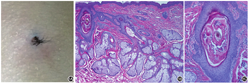 皮损临床及病理表现 1A:鼻根部孤立青褐色丘疹,可见中央开口,数根毛发穿出;1B:真皮内可见一囊腔,开口于表皮,其内壁为鳞状上皮,腔内有毛发及角质碎屑,周围皮脂腺结构呈放射状排列(HE × 40);1C:真皮内囊腔高倍图(HE × 100)