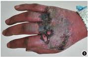 患者女,55岁,因右膝部破溃伴疼痛2个月,渐累及双上肢10 d,于2016年6月就诊。患者2个月前右膝部出现红斑、破溃,自行外用依沙吖啶未见明显疗效。10 d前累及右手背及左腕部,四肢皮肤肿胀。起病以来偶有咳嗽,无咳痰,无恶心、呕吐,有腹胀,无明显腹痛,大便正常。既往史:30年前患结核性腹膜炎,25年前患结核性胸膜炎。房颤、缩窄性心包炎、心包积液史4年。