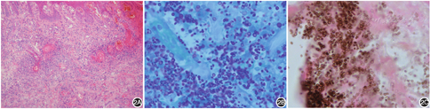 典型孢子丝菌病的病理表现为混合性肉芽肿和化脓性炎症,特征性结构如卵圆形或雪茄样厚壁孢子、星状体[2]。本例组织病理主要表现为白细胞碎裂性血管炎改变,组织坏死明显,病变中心可见大量孢子,而不是通常的感染性肉芽肿或化脓性混合炎症。大部分皮肤血管炎患者表现为白细胞碎裂性血管炎,可由原发性疾病所致,也可继发于药物、感染或潜在疾病,部分继发于感染如病毒、细菌、真菌、原虫、寄生虫感染[3]。真菌引起的白细胞碎裂性血管炎少见,常常发生在免疫功能低下或缺陷的患者,有报道曲霉、念珠菌、毛霉及组织胞浆菌均可引起白细胞碎裂性血管炎[4,5,6],尚未见孢子丝菌所致的白细胞碎裂性血管炎。目前认为,真菌感染继发的血管炎发病机制通常与真菌直接侵袭血管壁有关[7]。