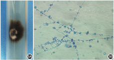 体检:心尖搏动减弱,腹部膨隆,腹部移动性浊音阳性。皮肤科检查:双手背、左手指指关节、左腕部、双膝关节皮肤散在大片浸润性、肿胀性暗红斑,表面有黄豆至鸽蛋大深在性溃疡,部分溃疡有少许脓性分泌物,周围黑痂(图1)。辅助检查:血常规白细胞13.26 × 109/L,中性粒细胞比例0.95,淋巴细胞比例0.03,中性粒细胞计数12.62 × 109/L(参考值1.80 × 109/L ~ 6.30 × 109/L,下同)。血生化:血钾3.33 mmol/L(3.5 ~ 5.3 mmol/L)、钠125.9 mmol/L(137 ~ 147 mmol/L)、氯87.0 mmol/L(99 ~ 110 mmol/L)、钙1.67 mmol/L(2.11 ~ 2.52 mmol/L);二氧化碳结合力36.40 mmol/L(23 ~ 31 mmol/L);γ谷氨酰转肽酶88.9 U/L(10 ~ 60 U/L),总蛋白38.9 g/L(65.0 ~ 85.0 g/L),白蛋白19.1 g/L(40.0 ~ 55.0 g/L);红细胞沉降率64 mm/1 h(0 ~ 20 mm/1 h);超敏C反应蛋白105 mg/L(0 ~ 3.5 mg/L),免疫球蛋白IgG 4.78 g/L(7.0 ~ 16.0 g/L),补体C3 0.65 g/L(0.9 ~ 1.8 g/L)。肾功能、甲状腺功能、尿常规、抗核抗体、肿瘤标志物等检查未见异常,乙型肝炎、梅毒、艾滋病相关检查未见异常。破溃处脓液细菌培养阴性。胸部X线片:双肺纹理增强,右侧少量胸腔积液。心电图检查:心房颤动伴快速心室反应。腹部彩超:肝肿大,实质弥漫性病变,腹腔大量积液。右手背溃疡处皮肤病理检查:表皮坏死、结痂,真皮浅中层可见多数小血管壁纤维素样变性,血管周围可见中性粒细胞及大量核尘,部分血管内可见血栓,真皮内组织坏死明显;PAS染色及六胺银染色坏死区可见大量圆形、卵圆形厚壁及芽生孢子(图2);抗酸染色阴性。右手背溃疡处皮损组织培养2周后可见单一菌落,呈深褐色有褶皱、绒毛样菌落,经小培养鉴定为孢子丝菌(图3)。提取右手背溃疡处皮损组织DNA,通过CAL基因特异性引物PCR扩增,产物经琼脂糖电泳得到预期的约770 bp的DNA片段。将PCR产物送生工生物工程(上海)股份有限公司测序,结果显示产物大小为674 bp,通过BLAST(http://blast.ncbi.nlm.nih.gov/Blast/)比对产物序列与多株球型孢子丝菌(Sporothrix globosa)的CAL基因片段序列相似度99%。