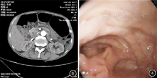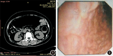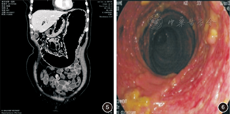 例1 患者女,44岁,因"突发下腹痛7 h"收住我院。患者无明显既往病史,入院前7 h突发下腹痛,伴肛门停止排便排气。入院时查体仅见左下腹部压痛,无反跳痛及肌卫,肠鸣音稍亢进。血常规示白细胞计数(WBC)29.0×109/L、中性粒细胞百分比(N)91.5%、血小板计数(Plt)150×109/L。CT及腹部立位片示横结肠明显扩张(图1)。肠镜检查见直肠至肝曲连续性病变,肝曲至回盲部及回盲瓣未见异常,病变处结肠袋结构消失,结肠壁呈颗粒样,组织高低不平,弹性差,呈铅管样改变(图2);病理示黏膜活动性炎伴溃疡形成,考虑溃疡性结肠炎。予抗感染、补液、支持、肾上腺皮质激素等治疗后,腹痛不缓解且渐加重,伴高热,查体下腹压痛及反跳痛明显,腹穿抽出淡血性液体,心率增快达150次/min,并出现败血症。立即转普外科行"全结肠切除、回肠-直肠吻合术",病理提示符合溃疡性结肠炎。随访5年至今患者情况良好。诊断为"溃疡性结肠炎,中毒性巨结肠"。