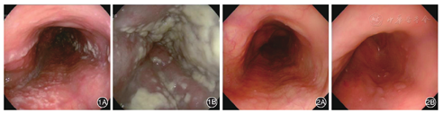 患者女,60岁,因吞咽困难伴吞咽痛2个月入院。患者2个月前因咽炎自服甲硝唑、克拉霉素8 d,后自觉吞咽困难伴吞咽疼痛,热食、热饮为著,有胸骨后不适、反酸,无发热、头晕,无心慌、胸闷等症状,近期体重无明显变化。1个月前在当地医院行胃镜检查发现念珠菌性食管炎,后停用抗生素,口服制霉菌素片100 IU/次,3次/d,疗程2周,吞咽困难等症状未见好转,遂来我院。既往史:反流性食管炎10余年;高血压15年;否认糖尿病史;自诉胃动力差多年,进食稍多即出现明显腹胀,口服多潘立酮片(吗丁啉)可改善腹胀症状,已停用。入院胃镜检查示食管中上段黏膜充血水肿,可见呈条状分布的白色斑块附着(图1A),食管中下段黏膜充血水肿,大量黄白色膜状及块状絮状物附着(图1B),刷片1张,真菌涂片见大量真菌孢子及真菌菌丝,胃腔内可见食物潴留。诊断为念珠菌性食管炎(Kodsi分级3级)、胃潴留、慢性浅表性胃炎、幽门螺杆菌(-)。嘱患者加强营养,少食多餐,口服布拉氏酵母菌散(法国百科达制药厂,注册证号:S20100086)0.25 g,2次/d,疗程4周。疗程结束后,患者诉吞咽困难及吞咽痛等症状消失。1个月后来院复查胃镜示食管黏膜光滑,血管走行清晰(图2);胃腔内可见少量食物潴留。诊断为胃潴留、慢性浅表性胃炎、幽门螺杆菌(-)。
